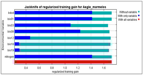 The predictive power of environmental factors is assessed using the jackknife of regularized training gain in MaxEnt models for Aegle marmelos.