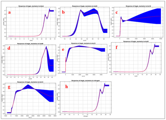 Response curve of a contributing variable in the distribution of Aegle marmelos. (a) Soil bulk density (bdod), (b) isothermality (bio03), (c) precipitation of the warmest quarter (bio18), (d) mean temperature of the wettest quarter (bio08), (e) precipitation of the coldest quarter (bio19), (f) annual mean temperature (bio01), (g) annual precipitation (bio12), and (h) total nitrogen.