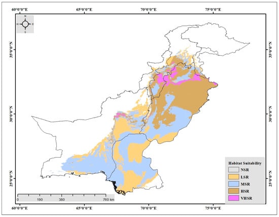 According to this study, the total potential habitat suitability (p > 0.2) for Pakistan may decrease in the future. This decrease is estimated to be at a rate of −1.3% compared to the current distribution range, resulting in a potential habitat suitability of 121,145 km2 under SSPs 245 of the 2050s and a −2.3% rate of change, leading to a potential habitat suitability of 131,145 km2 under SSPs 585 of the 2050s. Similarly, under SSPs 245 of the 2070s, the potential habitat suitability is expected to reduce to 118,045 km2, which is a −1.6% rate of change, and 101,145 km2 (−3.8% rate of change) under SSPs 585 of the 2070s. If we consider SSPs 245 in the 2050s, there is a prediction that the very high suitability habitat (VHS) will increase slightly from its current climate, specifically from 55,292 km2 to 56,170 km2 (0.4% rate of change). As a result, within the highly suitability habitat (VHS), the estimated potential suitable land area is reduced to 52,170 km2 (−0.1%) under SSPs 585 of the 2050s, 54,170 km2 (0.1%) under SSPs 245 of the 2070s, and 49,170 km2 (−0.4%) under SSPs 585 of the 2070s (Table 2).