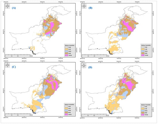 Based upon the observation of four future climate change scenarios, the highly suitable habitats predicted in Balochistan and Southern Punjab are expected to be lost by the 2070s. The western Khyber Pakhtunkhwa regions in Pakistan, southern Balochistan, central Punjab, and Sindh might face the disappearance of all current suitable and highly suitable habitats by the 2050s and 2070s under scenarios SSPs 245 and SPPs 585. Additionally, Upper Punjab, Peshawar, and Attok might only have marginally suitable locations in the arid region between 2050 and 2070 (Figure 8).