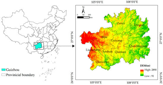 Guizhou Province has a total area of 176,000 km2 (103°36′–109°35′ E; 24°37′–29°13′ N) (Figure 1). The region has faced severe ecological challenges (e.g., soil erosion) due to its typical karst landscape and sensitive ecosystem [,]. In recent years, Guizhou Province has increased its ecological rectification and protection efforts, such as conducting mine ecological restoration and the integrated protection and restoration project in the Wuling mountain area. These policies and projects ensure the sound development of ecology in Guizhou Province.