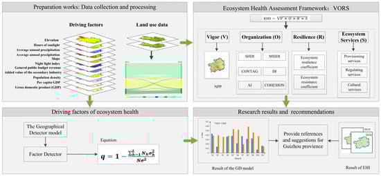 The research framework in this study comprised two stages (Figure 2). In the first stage, the vigor, organization, resilience, and ESs in 2010 and 2020 were separately quantified. Then, the EHI of Guizhou Province was evaluated. Land use was identified as one of the key influencing factors for ESs [,]. Therefore, the ES supply and demand evaluation matrices proposed by Burkhard et al. [] were adopted to assess ESs in Guizhou Province. In the second stage, the GD model was applied to identify key factors that significantly affected ecosystem health in Guizhou Province between 2010 and 2020.