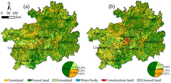 Land use patterns in Guizhou Province in (a) 2010 and (b) 2020.