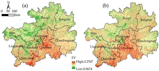 Ecosystem vigor in Guizhou Province in (a) 2010 and (b) 2020.