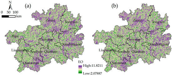 Using the equal interval method, the EHI in 2010 and 2020 was comprehensively evaluated and separated into five grades: Level 1 (0–0.2, extremely poor), Level 2 (0.2–0.4, poor), Level 3 (0.4–0.6, moderate), Level 4 (0.6–0.8, good), and Level 5 (0.8–1, relatively good) [,,]. As shown in Figure 9 Levels 2 and 3 were distributed in most areas of Guizhou Province in 2010, implying that human disturbance weakened local ecosystem health. Moreover, Level 1, covering 308.50 km2 (0.18%) of the overall area, was primarily dominant in the central metropolitan regions of Guiyang City and Zunyi City, which were associated with abundant construction land. Level 4 was scattered across Chishui City, Weining County, and Jiangkou County, characterized by national scenic spots and nature reserves. Level 5 was minimally distributed and scattered, covering an area of 31.76 km2 (0.02%). This rare distribution unveiled that despite the high vegetation coverage (including forestland and grassland), a significant gap remained in the orderly protection of the ecosystem in Guizhou Province. Overall, the distribution of the EHI in Guizhou Province was uneven; that is, the EHI in the southeast significantly exceeded that in the northwest.