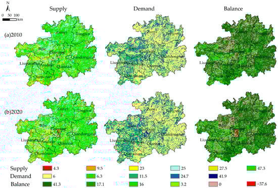 The supply, demand, and balance of ESs in 2010 and 2020 were quantified and mapped using the LULC matrix (Figure 8). In 2010, the highest values of ecosystem supply (47.3) were observed across most regions of Guizhou Province, indicating their strong ecological supply capacity. The western regions, such as Bijie, Liupanshui, and Qianxinan, were dominated by a higher value (27.5). The lowest value (4.3) occurred in Guiyang City, where a high population and urbanization resulted in insufficient ecological supply. By 2020, the lowest value of ecosystem supply (4.3) had spread to surrounding regions, predominantly in urban areas experiencing an increase in construction land. Simultaneously, the value of ecosystem supply in the western regions had decreased significantly, indicating that the distribution of the highest value (47.3) decreased, whereas the distribution of the lower value (27.5) increased. This change was likely due to increasing anthropological disturbances, such as road construction and farmland development. Furthermore, except for the central and western regions, the value of ecosystem supply in other regions showed minimal changes during the study period, benefiting from the effective protection of local ecology.