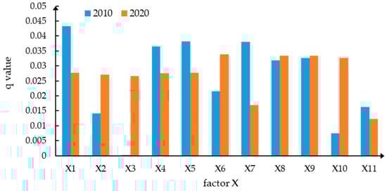 The q-statistic was used to determine the primary impact of each explanatory variable, X (influencing factors in Table 3), on the dependent variable, Y (EHI) []. The equation is as follows: