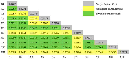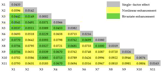 The results of the interaction detector demonstrated that the factor interactions increased the effects of each factor on ecosystem health. Figure 11 illustrates the outcomes of these factor interactions in 2010. There were 66 pairs of interactions between two factors on ecosystem health, in which 24 pairs exhibited a bivariate enhancement effect: X1–X3, X1–X4, X1–X5, X1–X7, X1–X8, X1–X9, X2–X3, X2–X4, X2–X5, X3–X4, X3–X5, X3–X6, X3–X7, X3–X8, X3–X9, X3–X10, X4–X5, X4–X9, X4–X10, X4–X11, X5–X7, X5–X8, X6–X7, and X7–X8. The remaining 31 sets exhibited a nonlinear enhancement effect, with 11 sets exhibiting a single-factor effect. In the nonlinear enhancement characteristic, the X9–X7 pair had the highest impact on ecosystem health in Guizhou Province, with the q-value being equal to 0.1087. The X8–X7 and X10–X7 pairs had increased influence on ecosystem health, with q-values of 0.1 and 0.0996, respectively. Figure 12 shows that the interactions between driving factors had bivariate and nonlinear enhancement effects on ecosystem health in 2020. A total of 24 pairs showed a nonlinear enhancement effect: X1–X3, X1–X7, X1–X11, X2–X3, X2–X7, X2–X11, X3–X4, X3–X5, X3–X7, X3–X11, X4–X5, X4–X7, X4–X11, X5–X7, X5–X11, X6–X7, X6–X11, X7–X8, X7–X9, X7–X10, X7–X11, X8–X11, X9–X11, and X10–X11. The remaining 31 sets exhibited a bivariate enhancement effect, with 11 sets exhibiting a single-factor effect. In this study, the interactions among different factors enhanced the influence of some factors on ecosystem health, such as X7–X11 (0.0776) and X7–X10 (0.067).