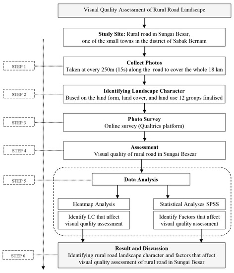 The final survey was distributed through social media using purposive sampling, limiting people living in Malaysia as participants. The survey data were collected over 30 days beginning 25 February 2023. The SPSS V26 program was used to analyze the survey results and identify the variables that influence visual quality evaluation. Figure 3 provides an overview of the research methodology employed in this study.