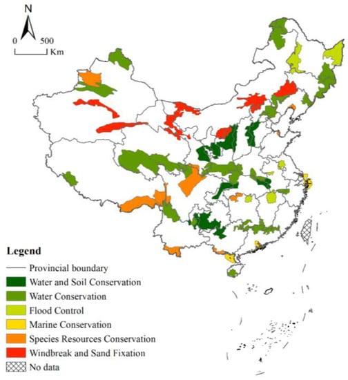 With the worsening of the ecological environment and the increasing conflict between humans and land, there is an urgent need to strengthen environmental protection efforts. In response to this, China has initiated national ecological function assessments and status surveys since the early 21st century and introduced the concept of national ecological function zoning in 2008. The zoning process involves delineating function areas covering a total of 2,336,700 km2, which accounts for 24.34% of China’s total land area []. These key ecological function zones are further classified into six distinct groups based on their dominant functions (Figure 1). Ecological function zoning entails dividing a region into areas with varying ecological functions, taking into account regional ecosystem patterns, ecological sensitivity, and the spatial differentiation of ecosystem service functions. For the purpose of this paper, which specifically focuses on land use and land cover change, marine protected areas within the ecological function areas are excluded from our analysis. The boundary data and classification principles of ecological function areas are sourced from the National Ecological Function Area Zoning published by the Chinese environmental protection department. It should be noted that compared with protected areas, ecological function areas pay more attention to the path of land use and cover change.