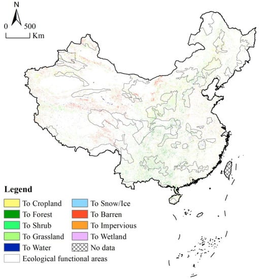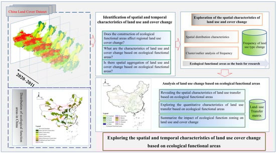 We conducted an examination of land use and cover changes within and outside China’s ecological function areas at the pixel scale to shed light on the role of these ecological function areas in the land use and cover change process. Distinguishing itself from previous research, this paper quantifies and visualizes the overall changes and intensities of land cover in China, as well as the year-by-year intensity of land use and cover change at the pixel level. We analyze the aggregation effect and transfer paths of land use and cover change while incorporating China’s ecological function areas, aiming to explore the differences in intensity and pathways of land use and cover change within and outside these ecological function areas. It is worth noting that the final results of this study may be influenced to some extent by the accuracy of remote sensing image interpretation. However, given the large scale of the study, any minor errors would not significantly impact the overall trends revealed by the research findings. Therefore, the analysis avoids relying on specific numerical changes and instead focuses on highlighting the typical characteristics of land use and cover change.