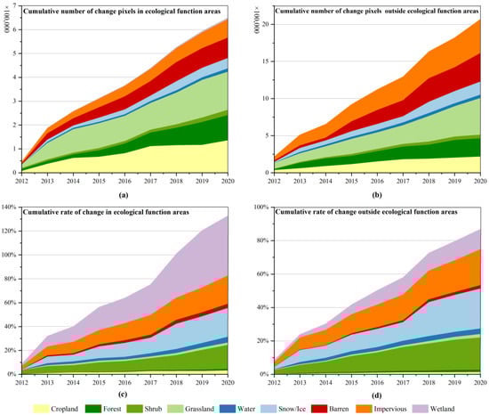 Within the ecological function area, the most notable relative cumulative change is observed in wetlands due to the small area, followed by ice, snow, and shrubs. Impervious surfaces show a strong cumulative rate of change with a larger cumulative number of change pixels. Barren land, forest, grassland, and cropland, on the other hand, demonstrate a low cumulative change rate, indicating a relatively stable condition due to their large proportion in the whole land use type.