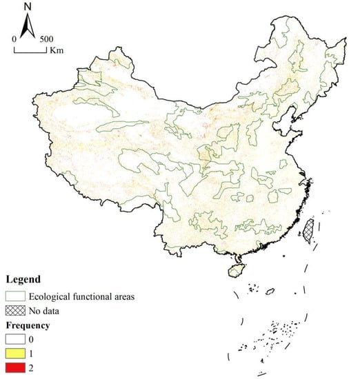 Overall, significant land fluctuations are observed in central, northern, northwestern (excluding desert areas), and northeastern China (Figure 5). Additionally, notable differences exist in the frequency of land use and cover changes based on ecological function areas. Specifically, land use and cover change pixels within the ecological function areas account for 8.5% of the total pixels in those zones, with the majority of changed pixels concentrated in the ecological function areas in central and northeastern China, as well as some southeastern regions. In contrast, land use and cover change pixels outside the ecological function areas only account for 7.9% of the total pixels.