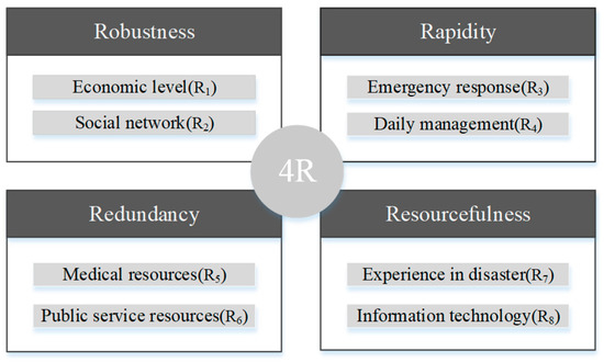 Cui et al., argue that a resilient city must demonstrate four characteristics: robustness, redundancy, rapidity, and resourcefulness [13]. A multi-perspective resilience approach based on the 4R framework provides a holistic view of a city’s resilience performance in response to public health disasters. The greater the significance of the aforementioned 4R characteristics in a city, the greater its resilience. Robustness and rapidity are considered to be the objectives of resilience, while diversity and redundancy are the means of achieving these objectives [10]. The basic level of urban resilience is determined by resourcefulness and redundancy, while the highest level is determined by the height of urban resilience. The greater the prominence of the 4R characteristics in a city, the greater its elasticity [14]. Robustness refers to the urban system’s capacity to maintain its normal function and stability in the face of external pressure [15]. Redundancy refers to the ability to maintain the original functional state through backup or other alternative systems, in spite of the damage caused to systems and the community during, for example, an epidemic. The resourcefulness of a city refers to its capacity to mobilize other alternative systems or elements from other systems to preserve its original state and better cope with disasters [16,17]. Rapidity, which refers to the speed at which a city can recover its normal operating capacity after a disaster and reflects the ability to control disaster losses when achieving predetermined goals, is another factor that determines resilience [18].