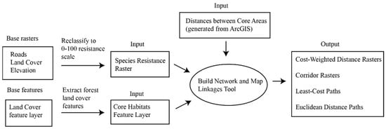 Linkage Mapper [28] is a free toolbox extension for ArcGIS (a subscription software) that can help identify where ecological corridors are or are needed for different species. Though there are many tools within Linkage Mapper, the Linkage Pathways tool was used in this research as it is the most useful for determining the location of stepping stones (unconnected vegetated patches) and wildlife corridors (vegetated links connecting habitat patches). The Linkage Pathways tool (Figure 2) uses species resistance rasters (rasters are images where pixels represent values of information, such as height) and core habitat features (features are vector shapes) to generate least-cost paths and cost-weighted distance maps [27].