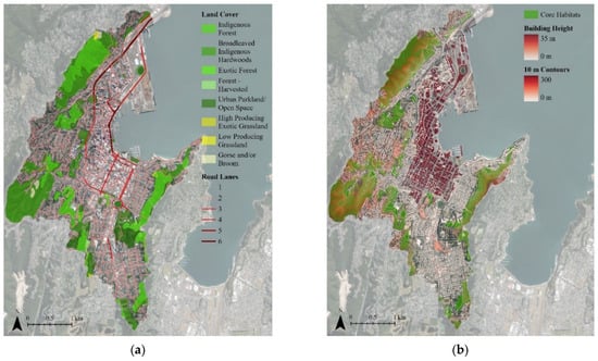 Landscape features of the study area for the Linkage Pathways tool: (a) land cover types and roads in the study area; (b) the three forest land cover types were extracted to create a core habitat map overlayed with topography contours and building heights. The base satellite image is from ref. [55] (CC BY 4.0).