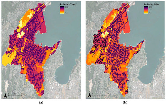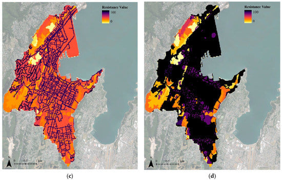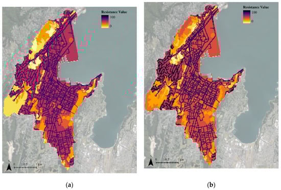 After obtaining the results from the Linkage Pathways tool for the existing green infrastructure network, the least-cost paths for all four species were overlayed and consolidated to identify key dispersal routes where additional habitats are needed to make the movement and dispersal of all four species easier. Figure 5a was used to guide the design of green roof corridors that could reduce the resistance values of the least-cost paths that connect core habitats. The Wellington Buildings shapefile [76] was used to change the land cover classification (i.e., material composition) of the building roofs along the least-cost paths (Figure 5b). The green roofs were assigned the same resistance values as the ‘Urban Parkland/Open Space’ classification due to their similarities to the constructed habitats and designed planting communities of typical urban parks. The diversity of the type of green spaces included in the ‘Urban Parkland/Open Space’ classification, including grassy open areas, gardens, and sparsely-treed areas [64], was the best proxy for the variation in green roof types, which can support plant communities in a manner that is similar to that of deserts/grasslands (extensive), meadows (semi-intensive), or sparsely-treed gardens/open areas (intensive) [85,86,87]. There was no change to the core habitats’ feature layer as the green roofs would likely be unable to replicate forest habitats well enough for them to be considered core habitats. The updated land cover file was used to generate new species resistance rasters (Figure 6). The Linkage Pathways tool was then run again for the four study species.