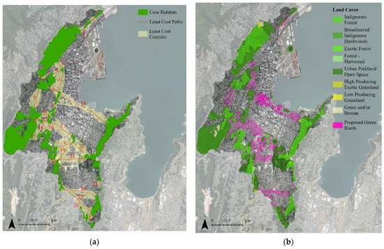 Urban green infrastructure design using outputs from the Linkage Pathways tool: (a) consolidated least-cost paths connecting core habitats for the four study species; (b) proposed locations for green roofs to supplement the existing green space network. The base satellite image is from ref. [55] (CC BY 4.0).