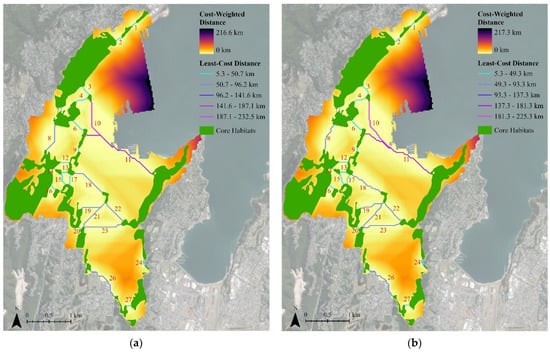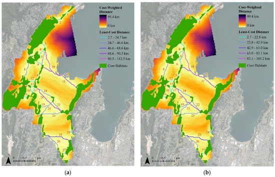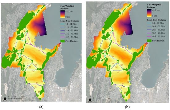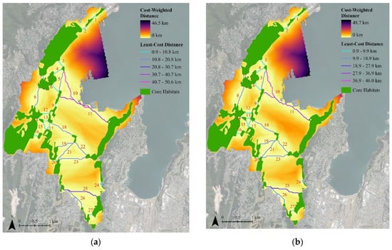 Least-cost paths and cost-weighted distance maps for the korimako for: (a) the existing green infrastructure network; (b) the proposed green infrastructure network. The numbers identify individual least-cost paths. The base satellite image is from ref. [55] (CC BY 4.0).