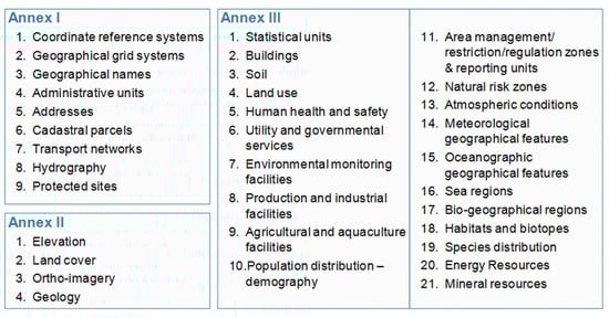 30]. The thematic scope of INSPIRE includes 34 cross-sectoral categories, named data themes (