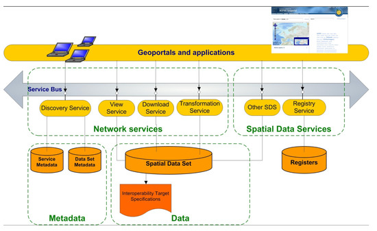 25]. By design, the infrastructure itself is built upon the SDIs established and operated by European Union member states that are then made compliant with the implementing rules, covering its core components: metadata, network services, interoperability of spatial datasets and services, data sharing and monitoring and reporting, together with the obligation to establish a national coordination body.