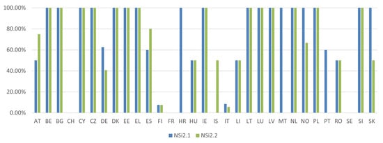 Figure 7 shows a high percentage in most of the countries. As for the indicators representing the percentage of spatial data sets available through viewing services (NSi2.1) and downloading services (NSi2.2),