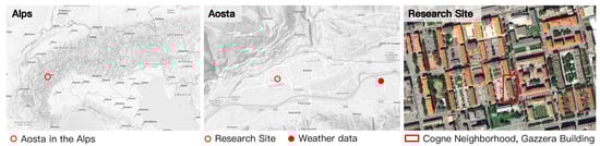 This study discusses a social housing building in which an older adult lives. The Aosta case study focuses on one building to explore the possibility of sustainable renovation at the scale of the Cogne Neighborhood, Italy. The case study is the “Gazzera Buildings,” highlighted in Figure 2. The neighborhood was born in the early 1900s as an “ultramodern” area of the city, housing the workers of the steel company Cogne Acciai Speciali. After over a century, the neighborhood has gradually deteriorated and lost its original connotation, openness, representativeness, and vitality. It cannot meet ever-changing social needs and sustainable development goals. The Cogne block is inserted in Alpine urban climatic conditions. The block has an urban morphology typical to blocks of the same epoch in different urban contexts. Therefore, the social housing renovation case study in Aosta has broader significance and applicability than the local context. The Gazzera in-line houses constitutes the expansion towards the West during the post-war reconstruction period, on the model of a multi-story building with balcony access to workers’ homes in parallel lines with a north-south orientation.