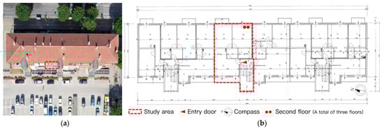 Aosta Social Housing: (a) Gazzera building top view; (b) Building second-floor plan.