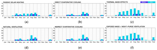 The psychrometric chart of the weather tool is suitable for residential buildings with fewer internal thermal sources, so it has been considered convenient for studying the apartment in Aosta. The weather tool provides the analysis function of a psychrometric chart, which can analyze various active and passive design strategies in the psychrometric chart based on meteorological data. Among them, passive systems are closely related to architectural design. Proper use of passive strategies by architects can reduce the impact of buildings on the surrounding environment and the cost of heating, air conditioning, and operating fees. Active methods can also be divided into high-energy low-efficiency and low-energy high-efficiency. Energy can be saved by analyzing the operational strategy on the psychrometric chart. The area shown on the psychrometric chart suits active cooling techniques, including mechanical ventilation, evaporative cooling, et al. The psychrometric chart determines the relationship between temperature, moisture content, and thermal environment. It can be used in the climate design process to intuitively analyze and determine the cold, hot, dry, and wet conditions of the indoor and outdoor climate of the building, as well as the deviation from the comfort zone. The blue line encloses the thermal comfort zone in the figure. Figure 4b shows the selection of six design strategies (passive solar heating, thermal mass effects, exposed mass + night-purge ventilation, natural ventilation, direct evaporative cooling, and indirect evaporative cooling) to achieve different degrees of comfort zone improvement. Figure 5 shows the comfort percentage for the selected six different design strategies. The analysis of passive design techniques is based on simple psychrometrics. Graphical results show the ratio of hourly data points that fall within the base and extended comfort zones due to the effects of each technique. Using the ‘thermal mass effect’ and ‘Exposed mass + Night-purge ventilation’ strategies can obtain better benefits in summer.