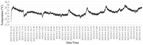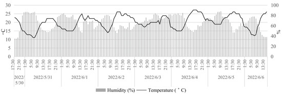 According to the Köppen climate classification, Aosta is located in the rain shadow of the Mont Blanc massif. It has a humid subtropical climate (Cfa), bordering on a cool semi-arid climate (BSk) and also bordering on an oceanic climate (Cfb). Aosta has a low average annual rainfall, cool to very cold winters throughout the year, hot summers, and a relatively dry climate. In the Trewartha climate classification, it is considered a temperate maritime climate (Do). The Gazzera building is a strip-shaped house with its long side pointing 12.7° north by west. The ‘world-weather. info’ website provides Aosta’s weather history data. The analysis of the climate characteristics in this area of Aosta shows that the intensity of direct sunlight is higher in June. The judgment that there is a ‘High risk of harm from unprotected sun exposure for people with sensitive skin types’ occurs after six months of exposure. Even in July, August, and September, direct sunlight can cause damage to people with sensitive skin. At the same time, there will be a phenomenon that ‘Meteosensitive people are likely to experience weather-related symptoms.’ Figure 6 records the onsite measurement time of this study, from 30 May to 6 June 2022, corresponding to the outdoor temperature and humidity. It can be seen from the figure that during the onsite measurement period, the outdoor temperature and humidity show periodic changes. The time when the air temperature is higher than 25 °C is rare. It fluctuates around 20 °C. The relative humidity is mostly higher than 50%.