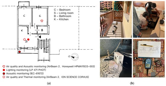 Since the Aosta social housing community in this research belongs to the large-scale construction in the same period, the house types are similar. Moreover, the number of floors of the building is three or four floors, the floor height is low, and the considerable distance between buildings will not cause shading problems. Currently, there are many elderly residents living in the community. Therefore, in this building, the physical environment measurements were performed in an apartment on the second floor (Figure 3). The balcony of this apartment has sun curtains for shading. The apartment was chosen for its dual street frontage, a distribution typical to several blocks’ flats. Currently, an 82-year-older woman lives in this household. Her daughter makes brief visits to take care of the older woman. This study takes the feedback from the residents as the basis for optimizing and renovating the room environment. This study’s methodology and optimization strategies apply to the social housing of other family types in the study area and other areas.