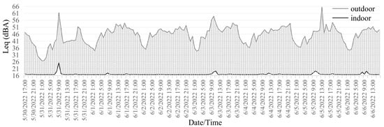Figure 8 shows the outdoor and indoor acoustic environment data. The overall acoustic environment of this social housing community is good. The sounds outside show a regular fluctuating pattern as the day and night change. There may be peaks at times due to outdoor parking noise. The indoor noise is hardly more significant than 20 dB (A), which proves the sound insulation effect of doors and windows to a certain extent, and at the same time, reflects the low activity intensity of the older adult neighbors. Sporadic peaks show a high correlation with outdoor conditions. Compared with the acoustic environment standard, it is found that the acoustic environment here is satisfactory, the negative impact on the older adults is negligible, and no primary intervention is required.