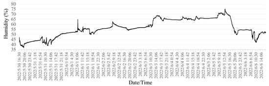 Figure 9 shows the temperature data for the living room area over this period. According to the statistical data during the actual measurement period, the outdoor weather in Aosta was cloudy from the end of May to the beginning of June, and the temperature did not exceed 25 °C most of the time. The survey data show that the indoor temperature fluctuates between 23.5 °C and 25 °C. It can be seen that this temperature range complies with ASHRAE 55-2020 and EN 16798-2019 on the thermal comfort temperature range of people. However, the measured indoor temperature is higher than the indoor temperature recommended by WHO. It is still necessary to reduce the indoor temperature to meet the indoor temperature needs of older adults. Figure 10 shows the humidity data in the living room area during measurement. It can be seen from the figure that indoor humidity fluctuates between 40% and 70% most of the time, meeting the humidity range requirements in CIBSE Guide A and EN 15251. It can also be seen from the figure that from the afternoon of 30 May to the noon of 5 June, the relative humidity increased from 37.5% to 72.4% and then began to drop. According to the historical records of Aosta weather data, the change of humidity is affected by the showery weather of the day. Moreover, the detection position in the living room is close to the window, and the humidity changes obviously.