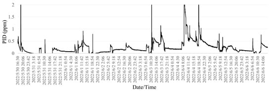 Figure 11 shows the TVOC data of the living room during the field measurement. It can be seen from the figure that the time when the indoor TVOC content is between 0 to 0.15 ppm accounts for about 35% of the entire measurement time, which meets the WELL building standard for indoor environmental quality assessment limits and meets the Japanese Renesas Electronics Corporation’s Level 1, indoor air quality performance is very good. TVOC content between 0.15 to 0.3 ppm accounts for about 40%, reaching Level 2 of Renesas Electronics, and the indoor air quality is good. TVOC content between 0.3 to 1.0 ppm accounts for about 25%. After excluding several abnormal data, it can be seen that it meets Level 3 of Renesas Electronics, and the indoor air quality performance is medium, with noticeable comfort concerns. Overall, most of the time, the indoor TVOC concentration reached a relatively good target, and in a few cases, the TVOC concentration reached a level below the middle class. The period with higher TVOC concentration is due to the impact of more frequent activities of the occupants, and the living room is used as a dining room. The living room is connected to the kitchen space, easily affected by the kitchen fumes. In addition, it can be seen from the figure that TVOC has different concentration levels on different dates. The concentrations in the last four days were higher than in the first. Moreover, it can be found that 24 h a day, the concentration from noon to night is more significant than in other periods. The reasons are mainly the activities of older adults and the use of household appliances. Generally speaking, the indoor TVOC content only sometimes meets the target requirements for indoor air quality. Indoor air quality needs to be improved by increasing the number of indoor air changes and ventilation.