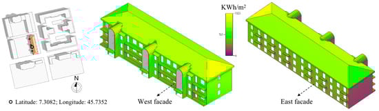 In the frame of integrated modeling, the analysis of the results from Revit 2023 software is being considered. Figure 12 shows that the cumulative solar radiation of the building’s exterior area of 2634 m2 reaches 1,333,742 kWh throughout the year, which is 506 kWh/m2. Gazzera’s west facade receives much more cumulative insolation than the east facade. Exposing the house to the intense afternoon sun can cause many problems: accelerated aging of furniture and wood, affecting the performance of air conditioners, increasing electricity consumption, etc. At the same time, it threatens the health of older adults with weak resistance. Therefore, the building urgently needs the sun exposure problem to be solved.