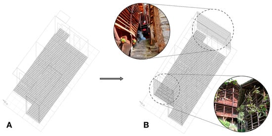 Retrofit design with wisdom from Walser haylofts. (A): before renovation; (B): after renovation. (https://www.alagna.it/en/routes–walks–trekking–monterosa/the–antique–hamlets/, accessed on 12 June 2023).