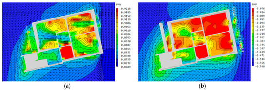 Phoenics 2019 software simulation results: (a) PMV (before renovation); (b) PMV (after renovation).