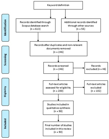 The first step of the review process was to define the keywords to identify relevant literature sources from the Scopus database. This search yielded 613 records. This step included the identification of additional literature from other databases (Google Scholar and Web of Science) which resulted in 55 additional articles.