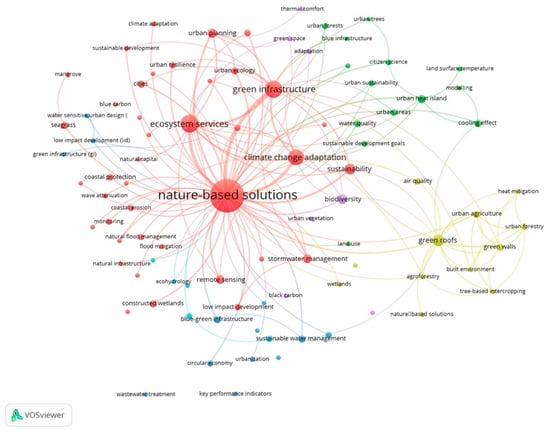 The context and content of relevant studies were analyzed using VOSviewer software (version 1.6.18). This software is a useful tool for analyzing and visualising bibliographic data, while providing a clear overview of the selected articles, and the progression of research over time [16,17,18,19]. Prior to bibliometric analysis and visualization, keyword combinations were entered into the database search engine. Subsequently, language and article type filters were applied. A thesaurus file was created with similar word combinations. The terms “nature based solutions”, “nature based solution”, in addition to “nbs” were merged with the term “nature-based solutions” to avoid a misleading analysis due to multiple term occurrences. This simplified the analysis of keyword co-occurrence in the literature. Criteria used to analyze the results included the following: