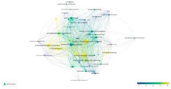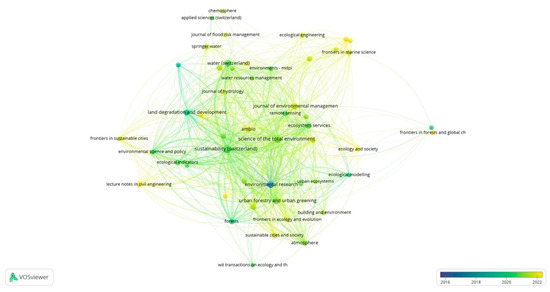 Figure 5 shows the citation score of the documents published. Figure 4 and Figure 5 are similar with slight differences when comparing criteria. With respect to the number of published studies, the larger circles indicate the greatest number of records per journal. It should be noted there are a number of recent publications, and citations for newly published records are anticipated to increase as interest in the quantitative evaluation of NbS performance grows.