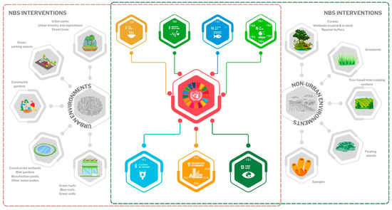 Additionally, this methodology was used to categorize NbS interventions and the associated sensing and measurement techniques that support the achievement of the UN SDGs, in conjunction with their targets and indicators [6]. There are 17 sustainable development goals established by the United Nations, focused on eradicating poverty, and improving environmental and socioeconomic outcomes. There are interdependencies between the goals, in addition to the related targets (169) and indicators (230).