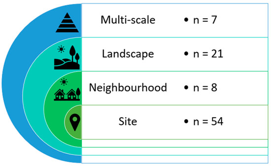 Temperature regulation studies have been conducted at various scales ranging from the microscale to the landscape scale. Sensing methods used include remote sensing and field-based assessments. Remote sensing approaches tend to focus on land surface temperature (LST) [87,150] while field-based assessments measure the micrometeorological parameters in-situ [151,152,153,154,155,156,157,158]. Studies have also assessed the role and effect of NbS configurations (i.e., size, shape, and proximity) in cooling urban areas [159,160]. Fewer studies [46], however, consider an integration of micro and mesoscale measurements to assess the efficacy of NbS interventions in lowering ambient and land surface temperatures.