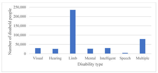 Tianjin, a significant industrial megacity southeast of Beijing, was chosen as the study area. According to the Tianjin Master Plan (2021–2035), Tianjin’s sub-districts can be classified into three regions: urban center (the central urban area, encompassing inner circles), urban fringe (located between urban and rural areas surrounding the central urban area), and rural areas (outer city regions and predominantly rural areas) (Figure 1). In 2020, the number of certified disabled individuals reached approximately 350,000, representing a diverse cross-section of ages, genders, and types of disabilities. There are seven types of disabilities, including up to 235,200 persons with limb disabilities, fewer than 10,000 individuals with speech and multiple disabilities, and between 20,000 and 30,000 persons with intellectual, mental, hearing, and visual disabilities (Figure 2).