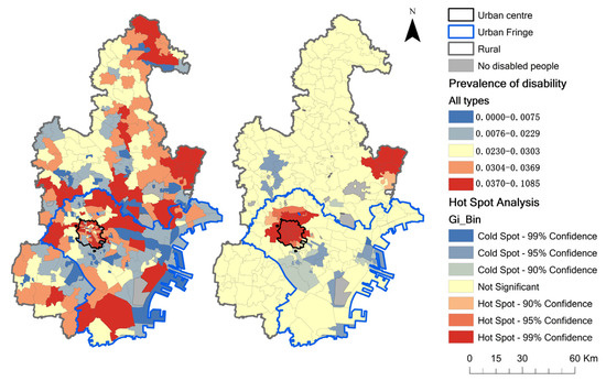 The distribution of hotspots for the prevalence of mental disabilities (PoD_mental) (Figure 4d) was relatively dispersed, with significant hotspots primarily concentrated in the urban center, where the PoDs for all sub-districts was approximately over 2.9%, and in remote rural areas with PoDs exceeding 1.7% for some sub-districts. Cold spots were identified in suburban rural areas with PoDs below 0.4%.