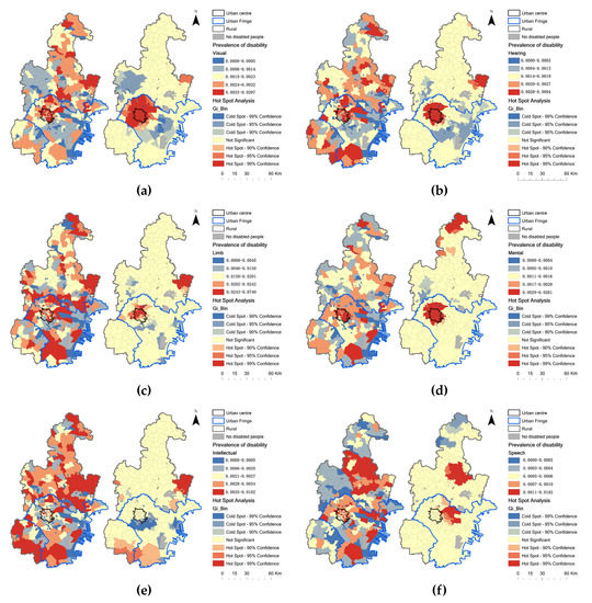 Spatial distribution and cold and hot spot spatial pattern of different types of PoDs in Tianjin. (a) PoD_visual; (b) PoD_hearing; (c) PoD_limb; (d) PoD_mental; (e) PoD_intellectual; (f) PoD_speech.