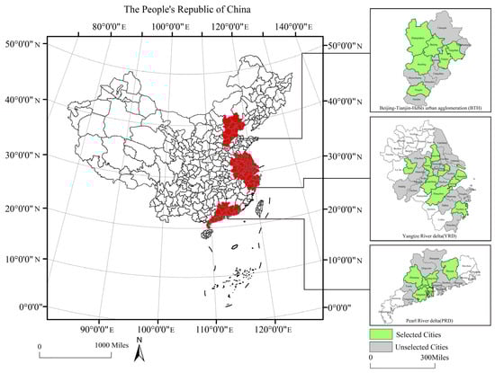 The BTH, YRD, and PRD regions are highly urbanized areas. From 1994 to 2014, these three major urban agglomerations not only ranked among the top three in terms of annual average GDP, but also ranked among the top in terms of the increase in the total GDP. BTH, YRD, and PRD are in the economically developed eastern coastal areas. The total area of BTH is 216,000 km2. The permanent population of Beijing is 21.89 million, and the population aged 60 and above reached 4.30 million at the end of 2020, accounting for 19.70% of the total population. YRD is in the lower reaches of the Yangtze River, with a total area of 358,000 km2. At the end of 2020, the number of permanent residents in Shanghai reached 24.88 million, and the population aged 60 and above reached 5.82 million, accounting for 23.4% of the total population. PRD is in the lower reaches of the Pearl River in Guangdong Province, with a total area of 56,000 km2. By the end of 2020, the number of permanent residents in Guangzhou reached 18.74 million, and the number of people aged 60 and above reached 1.80 million, accounting for 18.27% of the total population. The total populations, numbers of elderly people, and their proportions in the total populations of the three major urban agglomerations are large, and the regions’ economic and geographical advantages are obvious. Therefore, this research explores the specific impacts of urban environment, social environment, individual health, and sociodemographic characteristics on elderly people’s sense of safety, with cities as the basic unit. Choosing these three major urban agglomerations as research case sites confers a certain typicality and representativeness. Based on the sample size limitations of existing databases, nine cities in YRD, six cities in BTH, and eight cities in PRD were selected (Figure 1).