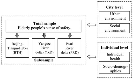 With all the data prepared, we used the linear regression model to explore the impact mechanisms of urban environment, social environment, individual health, and sociodemographic characteristics on elderly people’s sense of safety in total sample and three major urban agglomeration subsamples. The research framework is shown in Figure 2.