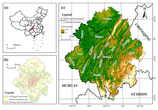 Study area (Chongqing Metropolitan Area, China). Note: (a) The geographic location of the study area within China. (b) Range of simulated spatial units in the study area. (c) The location conditions and elevation of the study area.