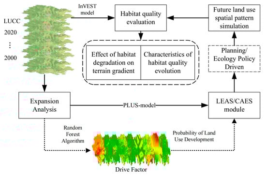 Ecosystem services and biodiversity are crucial for the survival of humans [1]. Habitat quality represents the ability of ecosystems to support the survival and sustainable development of species [2], and it is an important indicator for measuring regional biodiversity and ecosystem service values [3]. In the process of rapid urbanization globally, intense land transformation has affected the energy and material flow cycles between habitat units. The encroachment of urban construction areas on natural ecological landscapes directly leads to a decrease in biodiversity and a reduction in ecosystem service values in the original habitats, which directly impacts the well-being of local residents [4,5]. There is a close relationship between land use changes and habitat quality changes, as human modifications to land use directly affect changes in regional habitat quality [6,7,8]. Therefore, in order to achieve goals such as promoting biodiversity conservation, ecosystem restoration and protection, and strengthening the sustainable use of natural resources in the Millennium Ecosystem Assessment [9], it is important to explore the spatial and temporal dynamics of land use patterns and habitat quality in regions in policy-driven contexts. This will help understand the dynamic impacts of land use changes on regional habitat quality, adjust land planning and ecological conservation strategies, balance the coordinated development among society, economy, and environment, and promote the construction of a green development system and the advancement of high-quality social development.