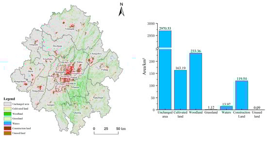 According to Table 4, it can be observed that from 1990 to 2020, the arable land area in the main urban area of Chongqing experienced a significant decrease, reducing by 1954.34 km2. On the other hand, the land areas of grassland, built-up land, forestland, water bodies, and unused land showed an increasing trend, with an increase of 2.37 km2, 1143.90 km2, 793.84 km2, 13.43 km2, and 0.79 km2, respectively. Over the course of 30 years, there were significant land use transfers in the main urban area of Chongqing, particularly from arable land to forestland and built-up land. The largest transfer was from arable land, with an area of 3586.26 km2, which was twice the area of incoming transfers (1631.92 km2), mainly in the form of forestland (2322.55 km2). The largest incoming transfer was for built-up land, with an area of 1195.42 km2, which was 23 times the outgoing transfer area (51.51 km2), and most of the incoming area came from arable land. Forestland had an outgoing transfer area of 1539.81 km2 and an incoming transfer area of 2333.65 km2, mainly due to the afforestation of converted cropland. Additionally, there were minor changes in the land areas of grassland, water bodies, and unused land, with no clear patterns of land conversion.